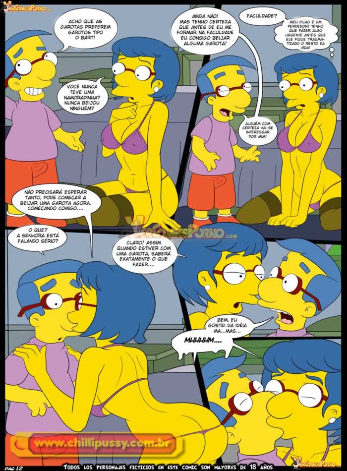 Parceiros e amigos visitantes do site Revistas e Quadrinhos, o Milhouse está muito tarado e safado nesse novo quadrinho erótico de Os Simpsons, a mãe do moleque pega ele assistindo um vídeo pornô e fica brava com o menino. Na casa dos Simpsons a putinha safada da Marge desfila nua pela casa e não vê a hora de dar uma surra de buceta no tarado do Milhouse.