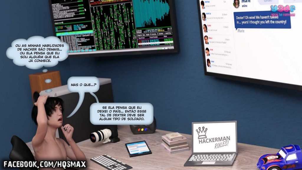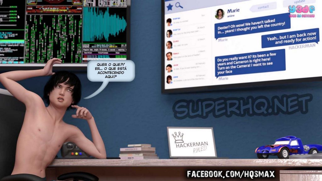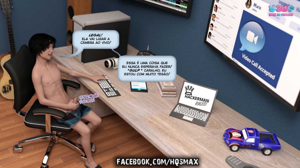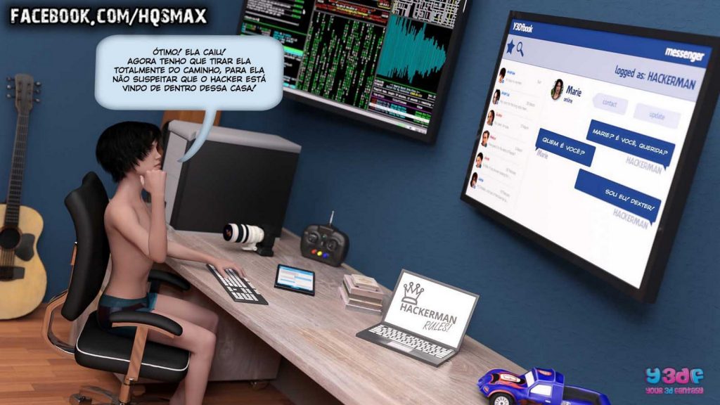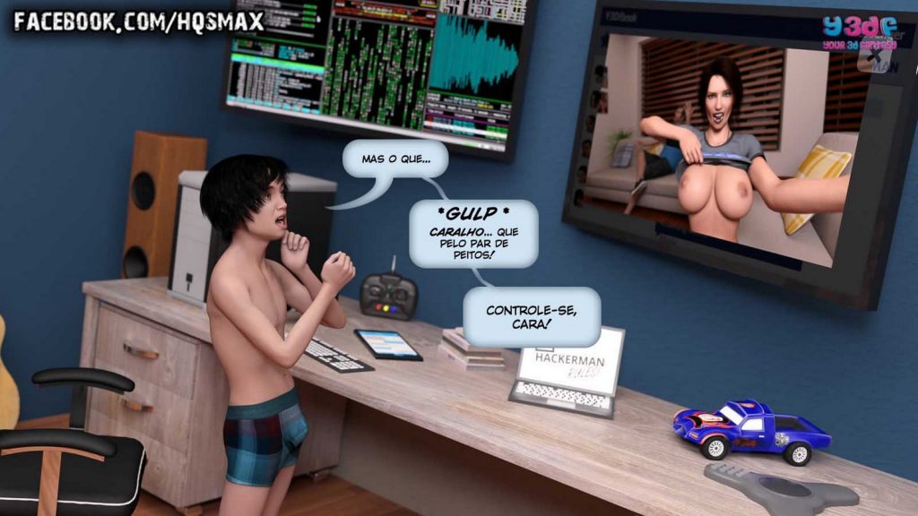 Parceiros e amigos visitantes do site Revista e Quadrinhos, Christian é um garoto nerd que adora “hackers” e fazer sacanagens com as outras pessoas. Desta vez, ele planeja se passar por outra pessoa no Y3DFBOOK, mas, para que tudo possa dar certo, ele precisa fazer alguns testes antes. E a sua cobaia para os testes, será a sua mãe gostosa e safada, que vai cair nessa sua pegadinha e vai dar um verdadeiro “show” com direito a boquete, anal e rola na buceta molhadinha da mamãe, para o delírio do garoto.